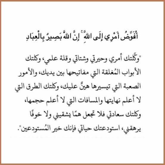 "وكلتك أمري وحيرتي وشتاتي وقلة علمي، وكلتك الأبواب المغلقة التي مفاتيحها بين يديك، والأمور الصعبة التي تيسيرها هينٌ عليك، وكلتك ... المزيد