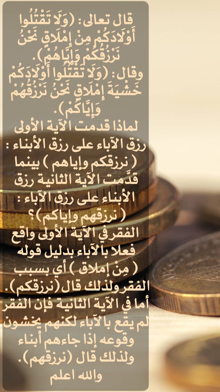 (وَلَا تَقْتُلُوا أَوْلَادَكُمْ مِنْ إِمْلَاقٍ نَحْنُ نَرْزُقُكُمْ وَإِيَّاهُمْ).