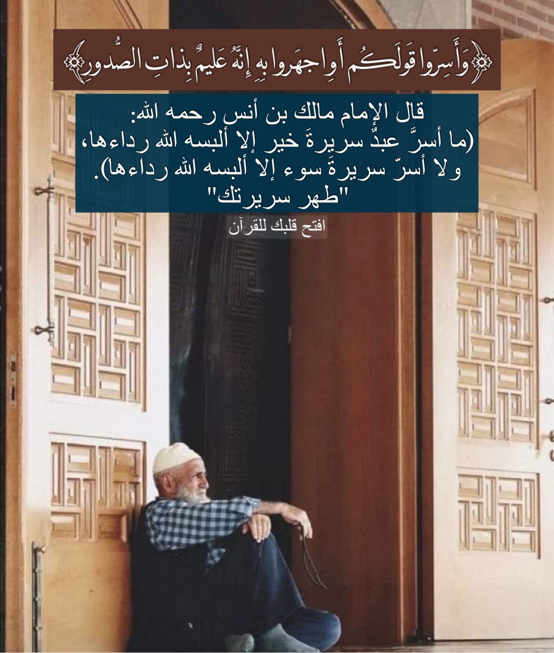 ﴿وَأَسِرُّوا قَوْلَكُمْ أَوِ اجْهَرُوا بِهِ إِنَّهُ عَلِيمٌ بِذَاتِ الصُّدُورِ﴾ ما أسرَّ عبدٌ سريرةَ خير إلا ألبسه الله رداءها، ولا أسرّ سريرةَ سوء إلا ألبسه الله رداءها. "طهر سريرتك".