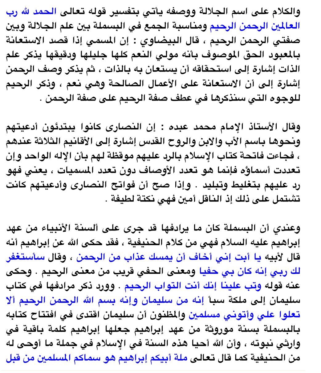 س/ في مناسبة الجمع في البسملة بين علم الجلالة، وصفتيّ (الرحمن الرحيم) نقل ابن عاشور مناسبة لـِ البيضاوي وثانية لمحمد عبده وثالثة له، ماهي هذه المناسبات الثلاث؟
