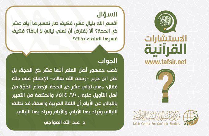 السؤال/ أقسم الله بليالٍ عشرٍ، فكيف صار تفسيرها أيام عشر ذي الحجة؟ ألَا يُفترَض أن تعني ليالِيَ لا أيامًا؟ فكيف فسرها العلماء بذلك؟