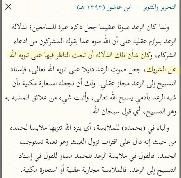 س/ ماذا يقصد ابن عاشور (بالصورة المرفقة) في أن إسناد التسبيح إلى الرعد مجاز عقلي؟ هل هو بمعنى من قال: بأن معناه هو تسبيح السامعين من العباد لصوت الرعد أم يختلف؟ وهل المجاز العقلي يدخل ضمن التفسير با... المزيد