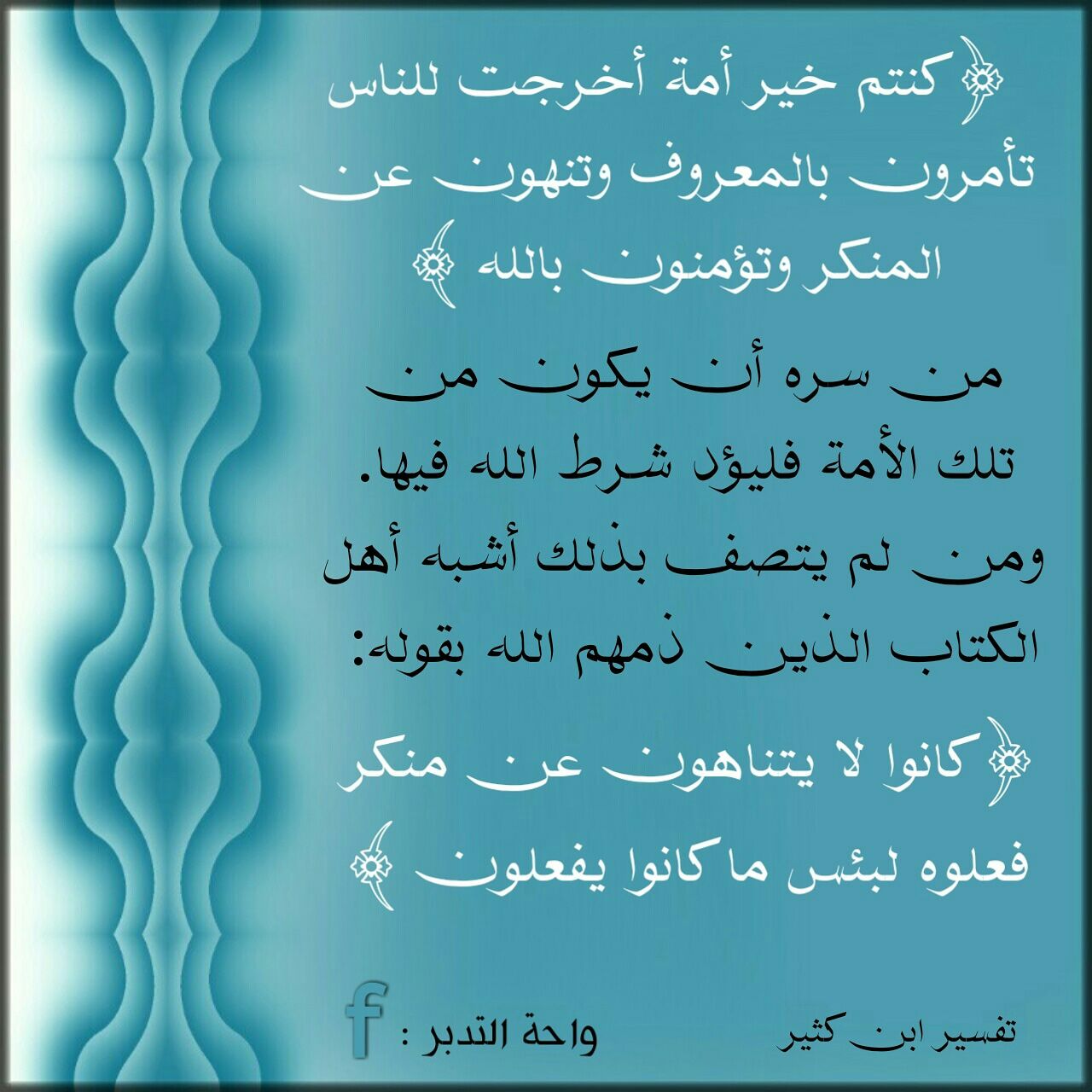 ﴿كُنتُمْ خَيْرَ أُمَّةٍ أُخْرِجَتْ لِلنَّاسِ تَأْمُرُونَ بِالْمَعْرُوفِ وَتَنْهَوْنَ عَنِ الْمُنكَرِ وَتُؤْمِنُونَ بِاللَّهِ﴾: من سره أن يكون من تلك الأمة فليؤد شرط الله فيها ... ومن لم يتصف بذلك أشبه أهل الكتاب الذين ذمهم الله بقوله: (كانوا لا يتناهون عن منكر فعلوه لبئس ما كانوا يفعلون).