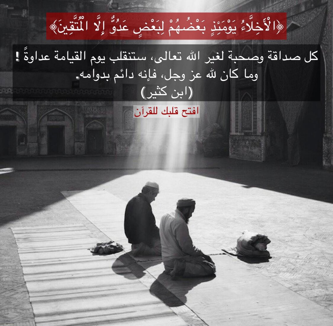 ﴿الْأَخِلَّاءُ يَوْمَئِذٍ بَعْضُهُمْ لِبَعْضٍ عَدُوٌّ إِلَّا الْمُتَّقِينَ﴾: كل صداقة وصحبة لغير الله تعالى ستنقلب يوم القيامة عداوةً! وما كان لله عز وجل، فإنه دائم بدوامه.