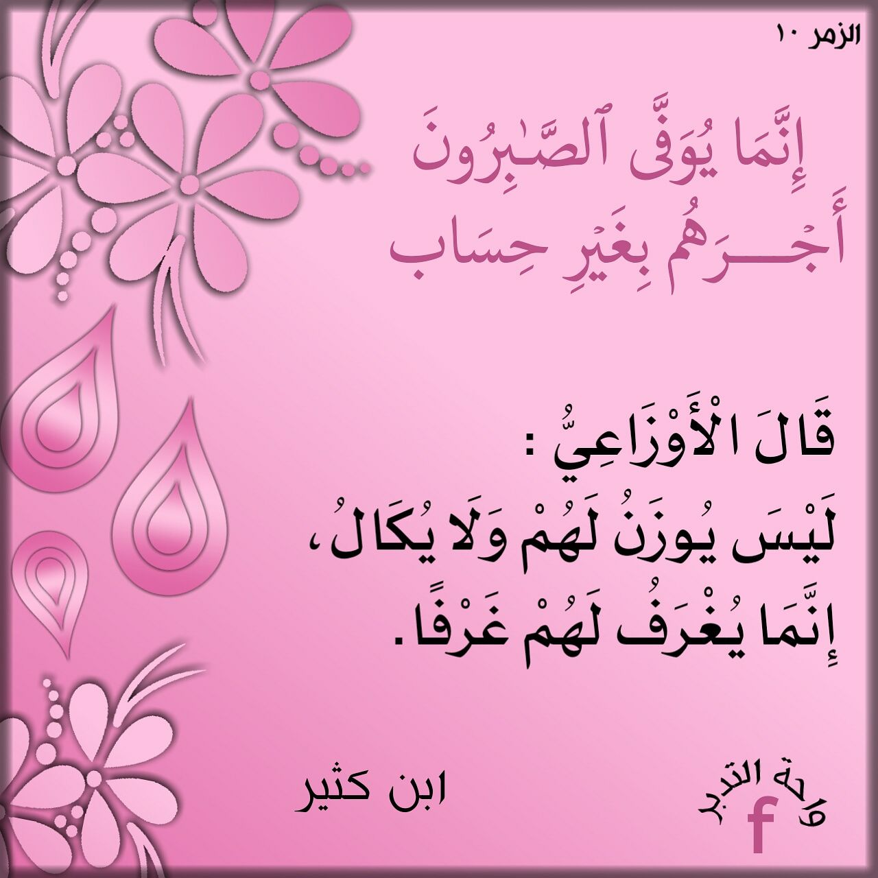﴿إِنَّمَا يُوَفَّى الصَّابِرُونَ أَجْرَهُم بِغَيْرِ حِسَابٍ﴾: قَالَ (الْأَوْزَاعِيُّ): "لَيْسَ يُوزَنُ لَهُمْ وَلَا يُكَالُ، إِنَّمَا يُغْرَفُ لَهُمْ غَرْفًا".