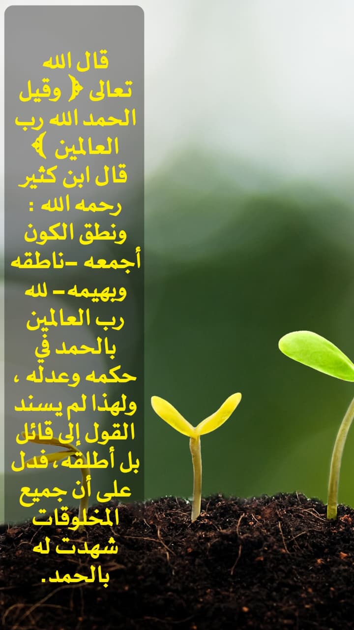 • "ونطق الكون أجمعه - ناطقه وبهيمه - لله رب العالمين بالحمد في حكمه وعدله ، ولهذا لم يسند القول إلى قائل بل أطلقه ، فدل على أن جميع المخلوقات شهدت له بالحمد".