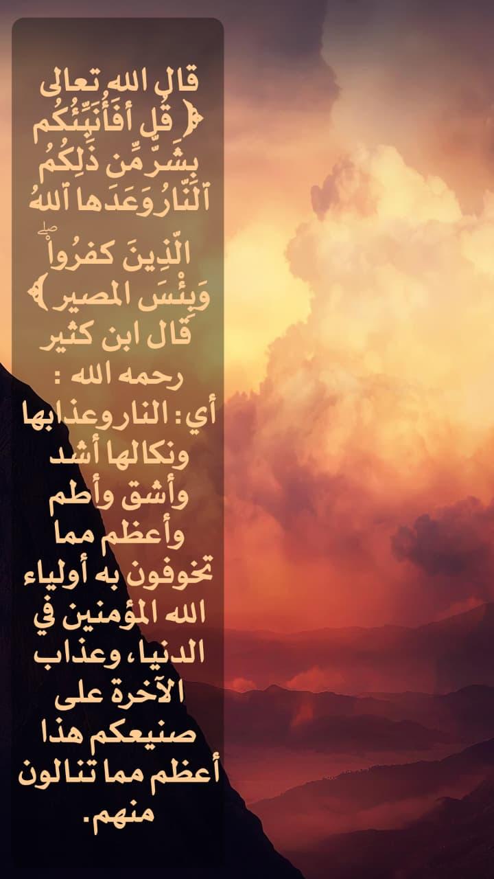 "قُلْ أَفَأُنَبِّئُكُم بِشَرٍّ مِّن ذَلِكُمُ النَّارُ وَعَدَهَا اللَّهُ الَّذِينَ كَفَرُوا وَبِئْسَ الْمَصِيرُ "