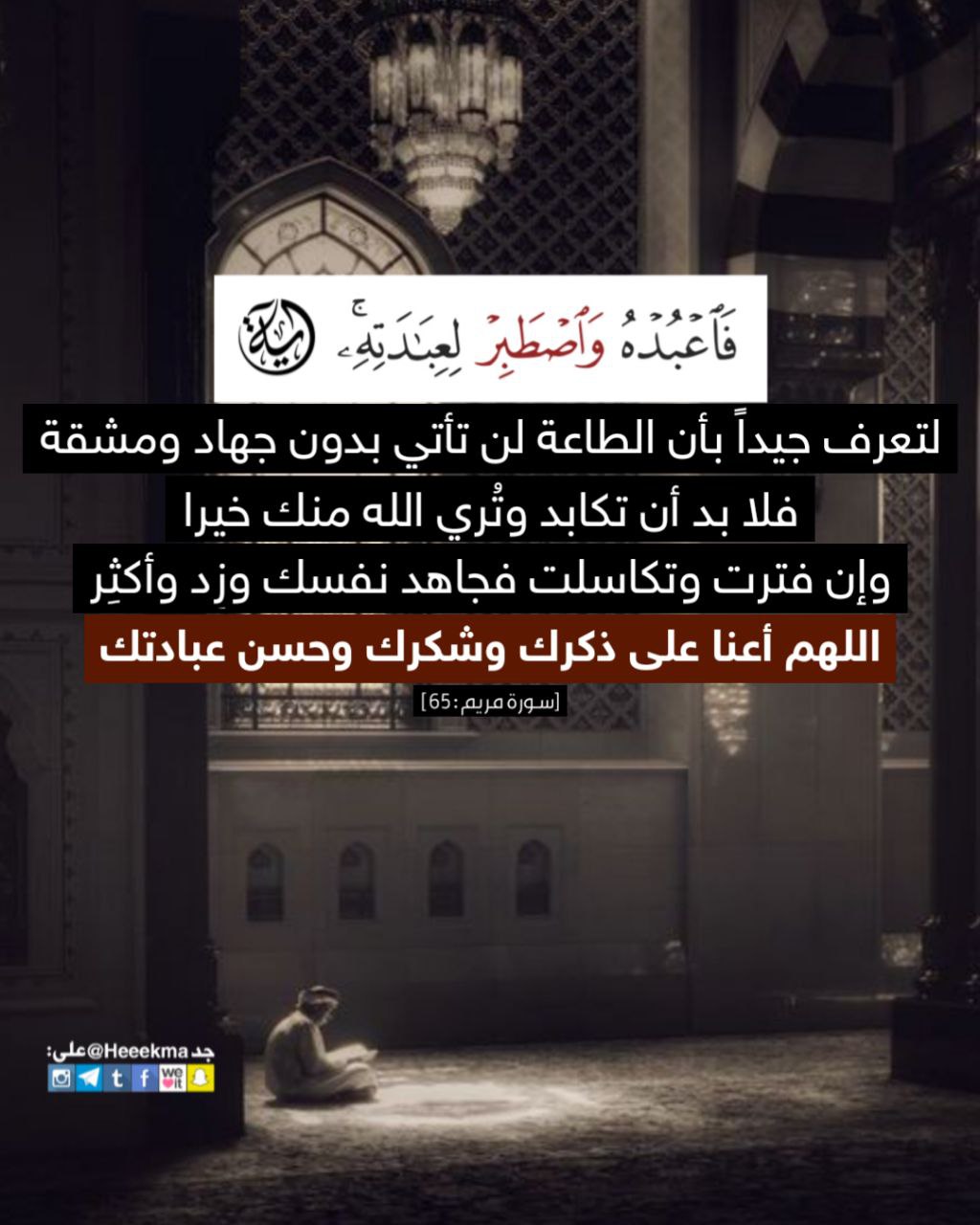 لتعرف جيداً بأن الطاعة لن تأتي بدون جهاد ومشقة، فلابد أن تكابد وتُري الله منك خيراً، وإن فترت وتكاسلت فجاهد نفسك وزِد وأكثِر، اللهم أعنا على ذكرك وشكرك وحسن عبادتك.