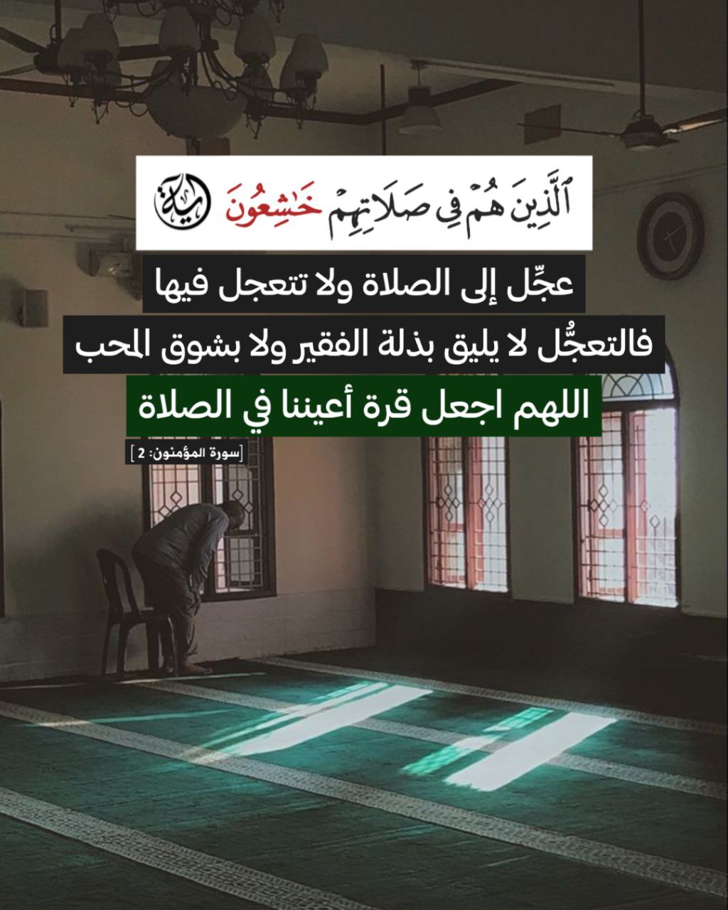 عجِّل إلى الصلاة ولا تتعجل فيها، فالتعجُّل لا يليق بذلة الفقير ولا بشوق المحب! .. اللهم اجعل قرة أعيننا في الصلاة.