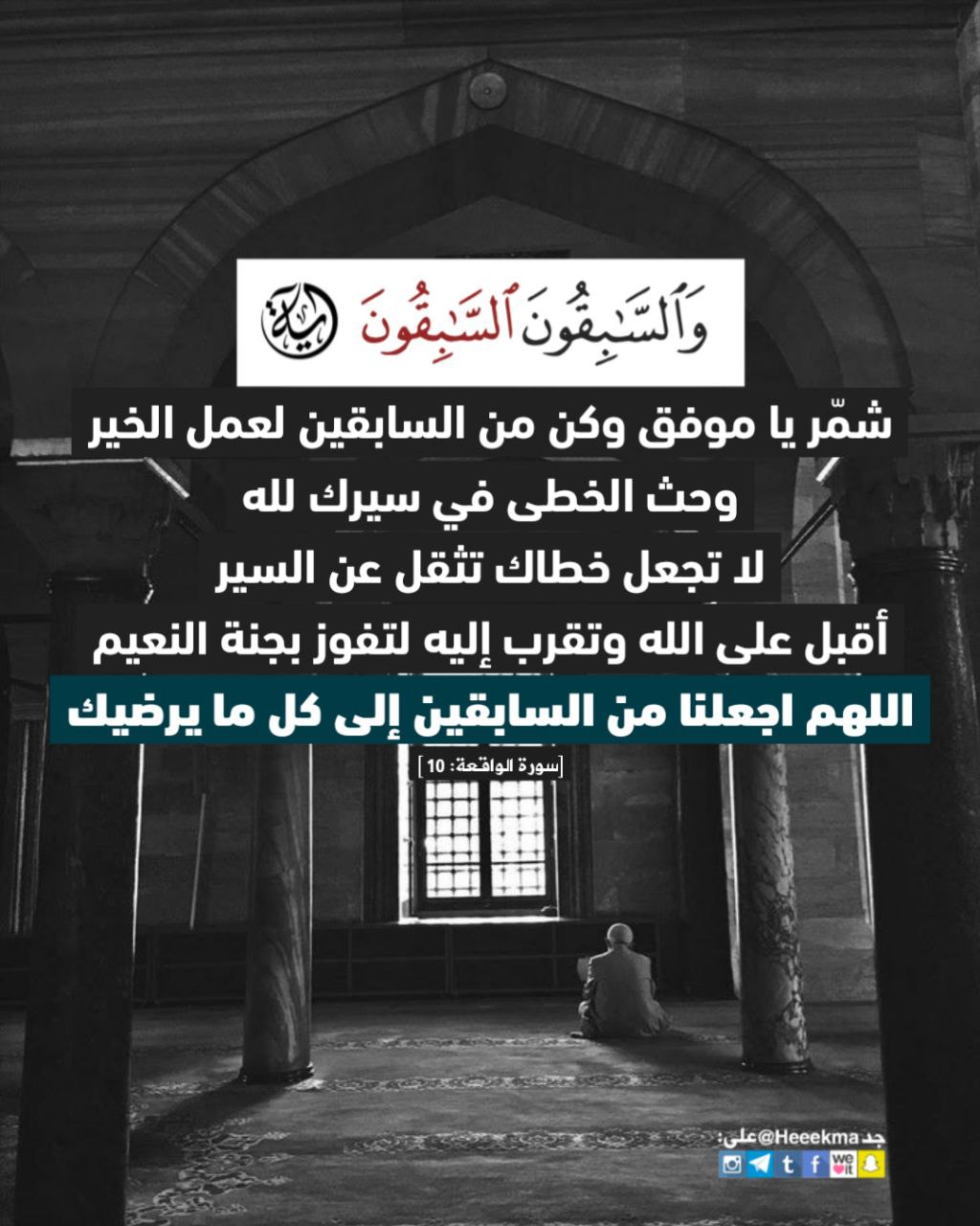 شمّر يا موفق وكن من السابقين لعمل الخير، وحث الخطى في سيرك لله، لا تجعل خطاك تثقل عن السير، أقبل على الله وتقرب إليه لتفوز بجنة النعيم .. اللهم اجعلنا من السابقين إلى كل ما يرضيك.