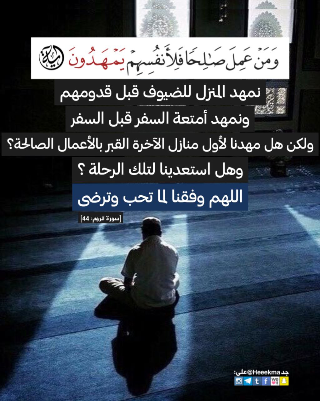 نمهد المنزل للضيوف قبل قدومهم، ونمهد أمتعة السفر قبل السفر، ولكن هل مهدنا لأول منازل الاخرة القبر بالأعمال الصالحة؟، وهل استعدينا لتلك الرحلة؟ ..(وَمَنْ عَمِلَ صَالِحًا فَلِأَنفُسِهِمْ يَمْهَدُونَ) .. اللهم وفقنا لما تحب وترضى.