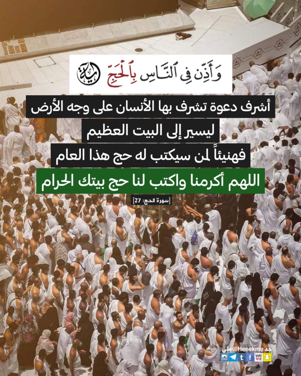 ﴿وَأَذِّن فِي النَّاسِ بِالْحَجِّ﴾ أشرف دعوة تشرف بها الانسان على وجه الأرض ليسير إلى البيت العظيم، فهنيئاً لمن سيكتب له حج هذا العام، اللهم أكرمنا واكتب لنا حج بيتك الحرام.