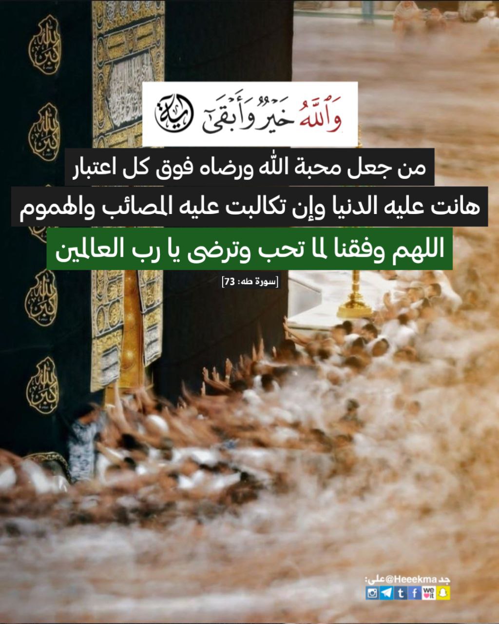 ﴿وَاللَّهُ خَيرٌ وَأَبقى﴾ من جعل محبة الله ورضاه فوق كل اعتبار، هانت عليه الدنيا وإن تكالبت عليه المصائب والهموم، اللهم وفقنا لما تحب وترضى يا رب العالمين.