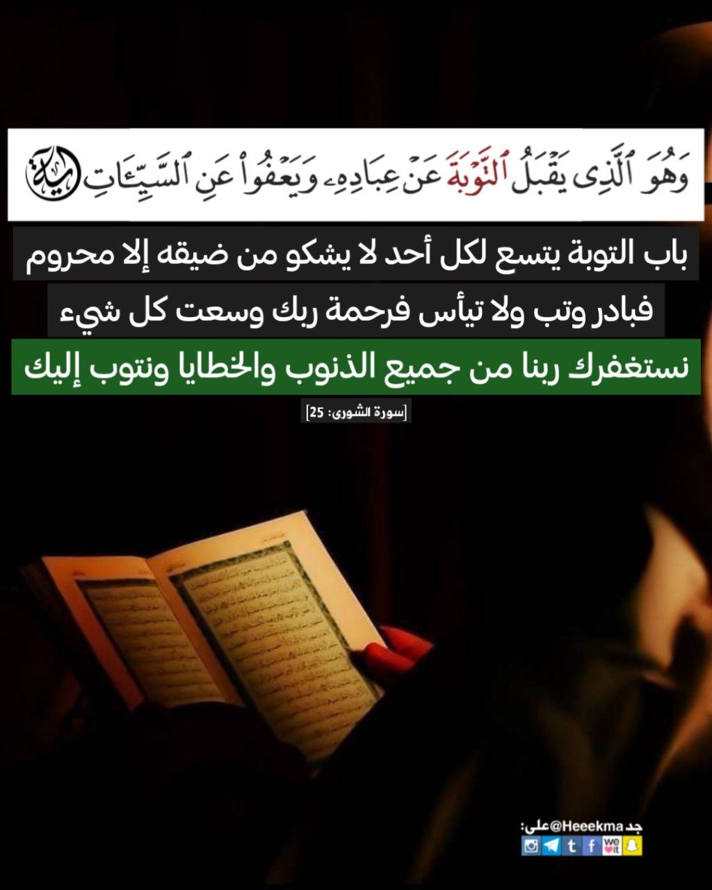 ﴿وَهُوَ الَّذِي يَقْبَلُ التَّوْبَةَ عَنْ عِبَادِهِ وَيَعْفُو عَنِ السَّيِّئَاتِ﴾ باب التوبة يتسع لكل أحد لا يشكو من ضيقه إلا محروم، فبادر وتب ولا تيأس فرحمة ربك وسعت كل شيء، نستغفرك ربنا من جميع الذنوب والخطايا ونتوب إليك.