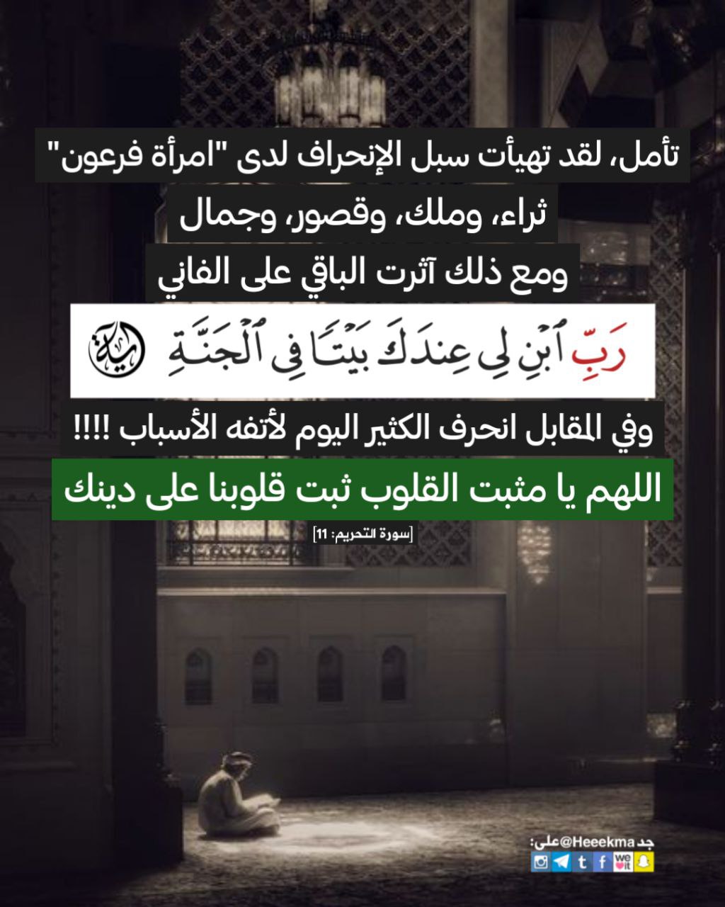 ﴿رَبِّ ابْنِ لِي عِندَكَ بَيْتًا فِي الْجَنَّةِ﴾ تأمل: لقد تهيأت سبل الانحراف لدى "امرأة فرعون" ثراء، وملك، وقصور، وجمال؛ ومع ذلك آثرت الباقي على الفاني (رَبِّ ابْنِ لِي عِندَكَ بَيْتًا فِي الْجَنَّةِ) وفي المقابل انحرف الكثير اليوم لأتفه الأسباب! .. اللهم يا مثبت القلوب ثبت قلوبنا على دينك.