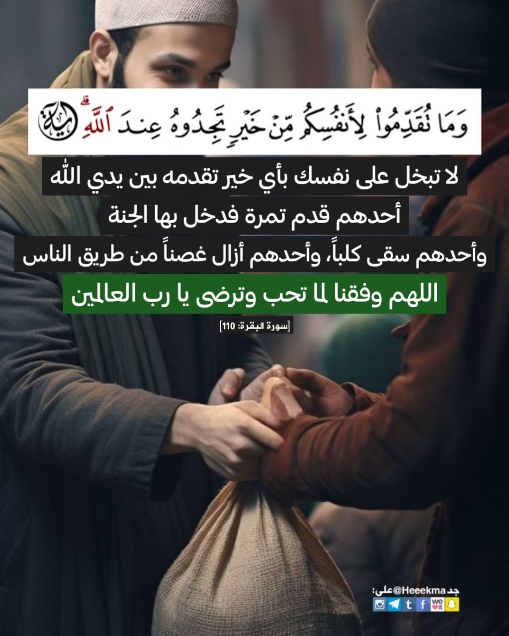 ﴿وَمَا تُقَدِّمُوا لِأَنفُسِكُم مِّنْ خَيْرٍ تَجِدُوهُ عِندَ اللَّهِ﴾ لا تبخل على نفس بأي خير تقدمه بين يدي الله .. أحدهم قدم تمرة فدخل بها الجنة .. وأحدهم سقى كلباً .. وأحدهم أزال غصناً من طريق الناس .. اللهم وفقنا لما تحب وترضى يا رب العالمين.