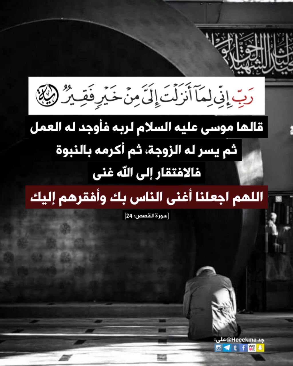 ﴿رَبِّ إِنِّي لِمَا أَنزَلْتَ إِلَيَّ مِنْ خَيْرٍ فَقِيرٌ﴾ قالها موسى لربه فأوجد له العمل، ثم يسر له الزوجة، ثم اكرمه بالنبوة، فالافتقار إلى الله غنى، اللهم اجعلنا أغنى الناس بك وأفقرهم إليك.