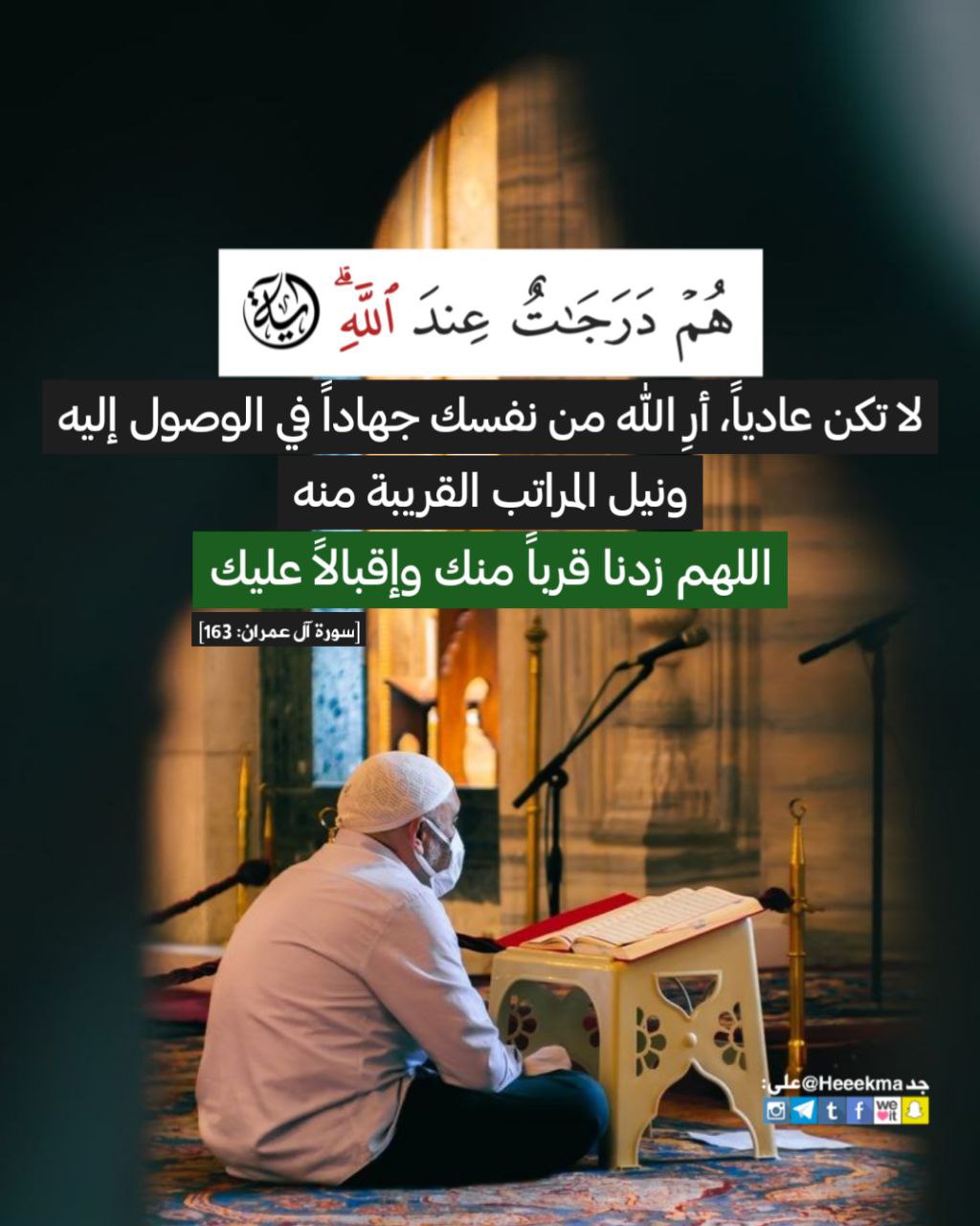 ﴿هُمْ دَرَجَاتٌ عِندَ اللَّهِ﴾ لا تكن عادياً، أرِ الله من نفسك جهاداً في الوصول إليه ونيل المراتب القريبة منه، اللهم زدنا قرباً منك وإقبالاً عليك.