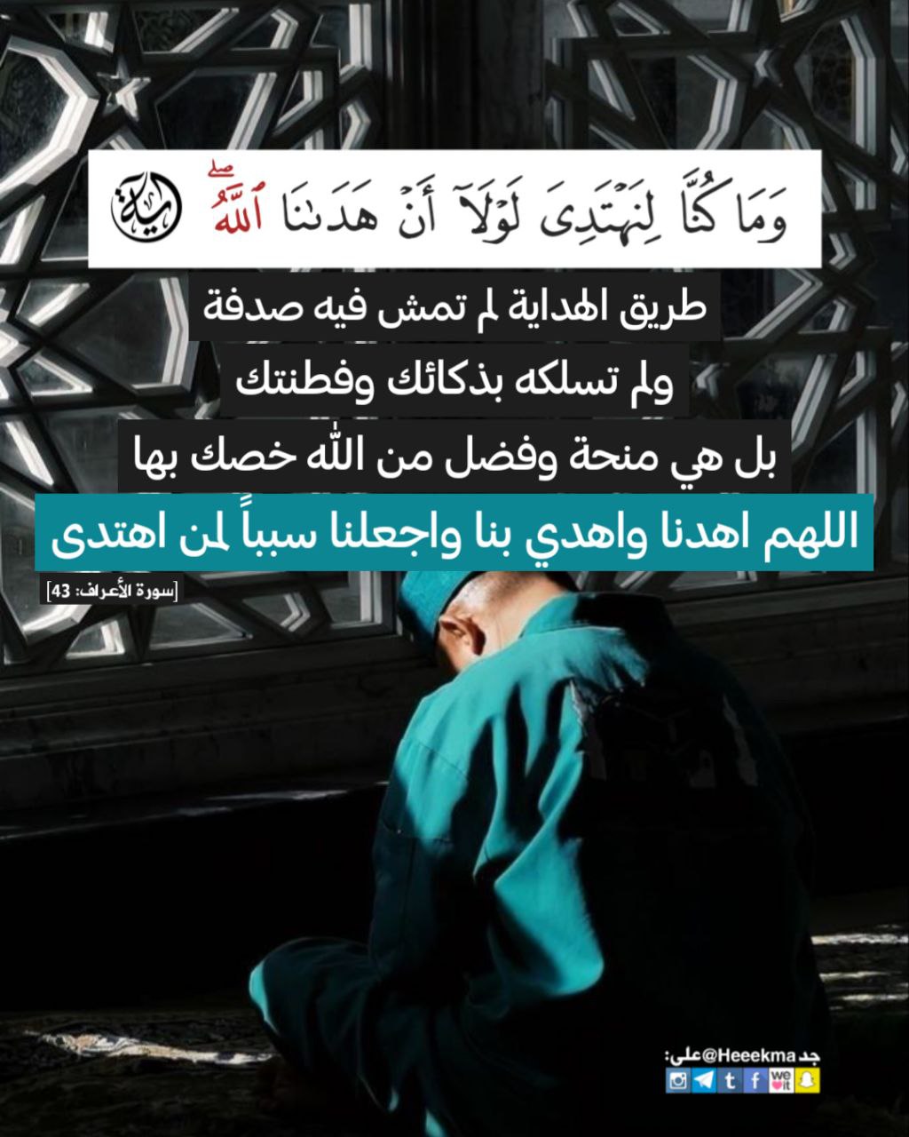 ﴿وَمَا كُنَّا لِنَهْتَدِيَ لَوْلَا أَنْ هَدَانَا اللَّهُ﴾ طريق الهداية لم تمش فيه صدفة، ولم تسلكه بذكائك وفطنتك، بل هي منحة وفضل من الله خصك بها، اللهم اهدنا واهدي بنا واجعلنا سبباً لمن اهتدى.