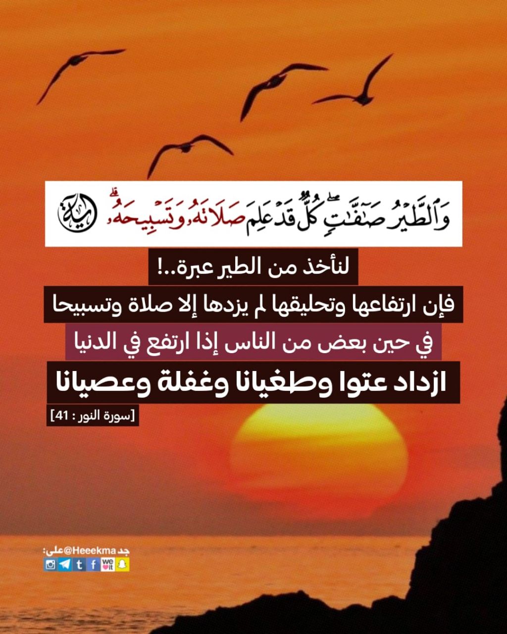 لنأخذ من الطير عِبرة ..! فإنَّ ارتفاعها وتحليقها لم يزدها إلا صلاةً وتسبيحًا .. في حين بعض من الناس إذا ارتفع في الدنيا ..! ازداد عُتوًّا وطُغيانًا وغفلة وعصيانًا.