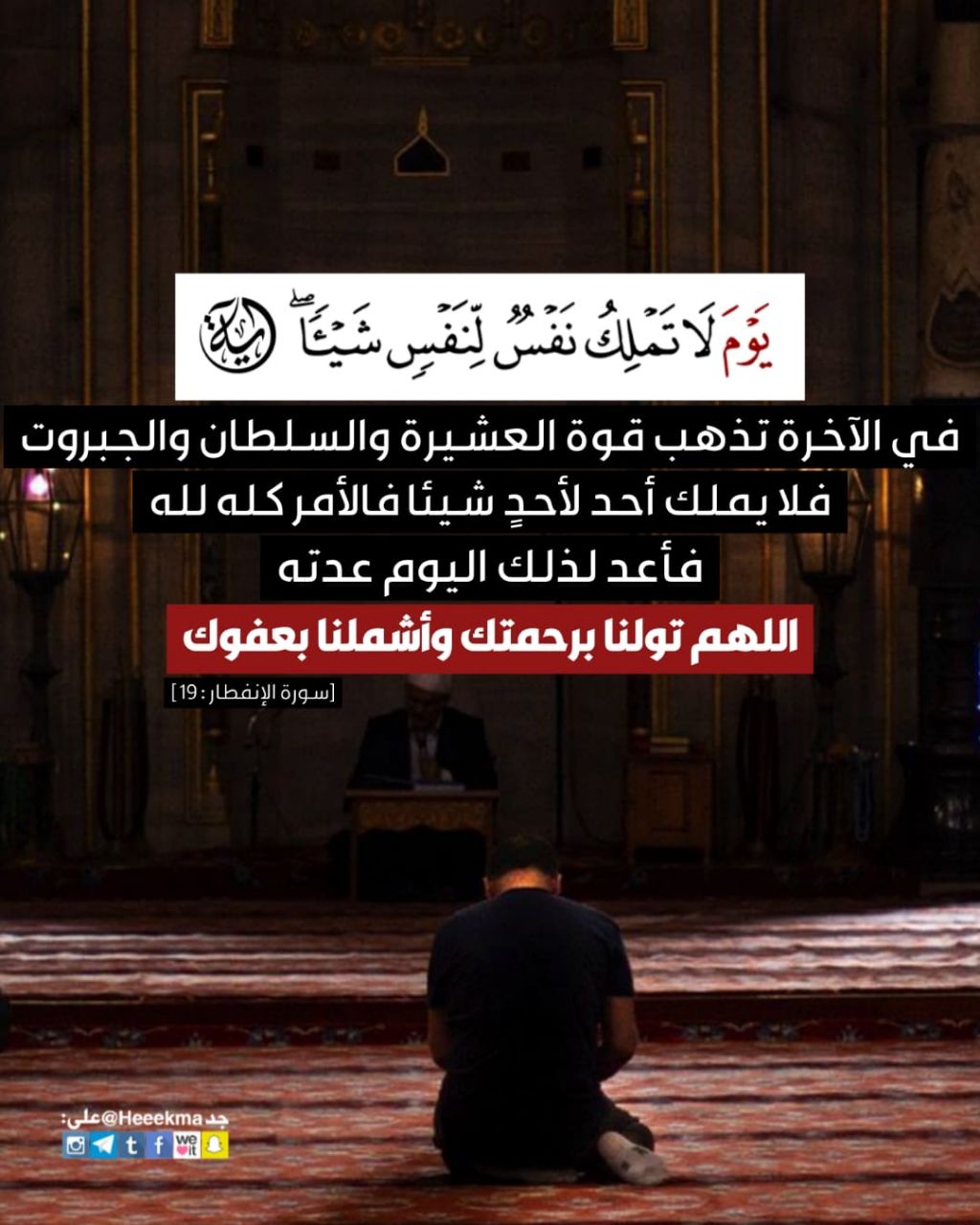 في اﻵخرة تذهب قوة العشيرة والسلطان والجبروت، فلا يملك أحد ﻷحدٍ شيئاً فالأمر كله لله، فأعد لذلك اليوم عدته، اللهم تولنا برحمتك وأشملنا بعفوك.