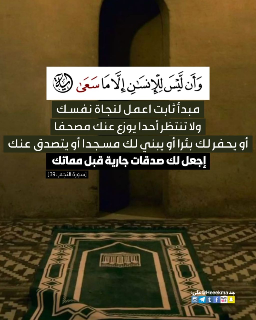 مبدأ ثابت اعمل لنجاة نفسك ولا تنظر أحدا يوزع عنك مصحفا او يحفر لك بئرا او يبني لك مسجدا او يتصدق عنك، إجعل لك صدقات جارية قبل مماتك.