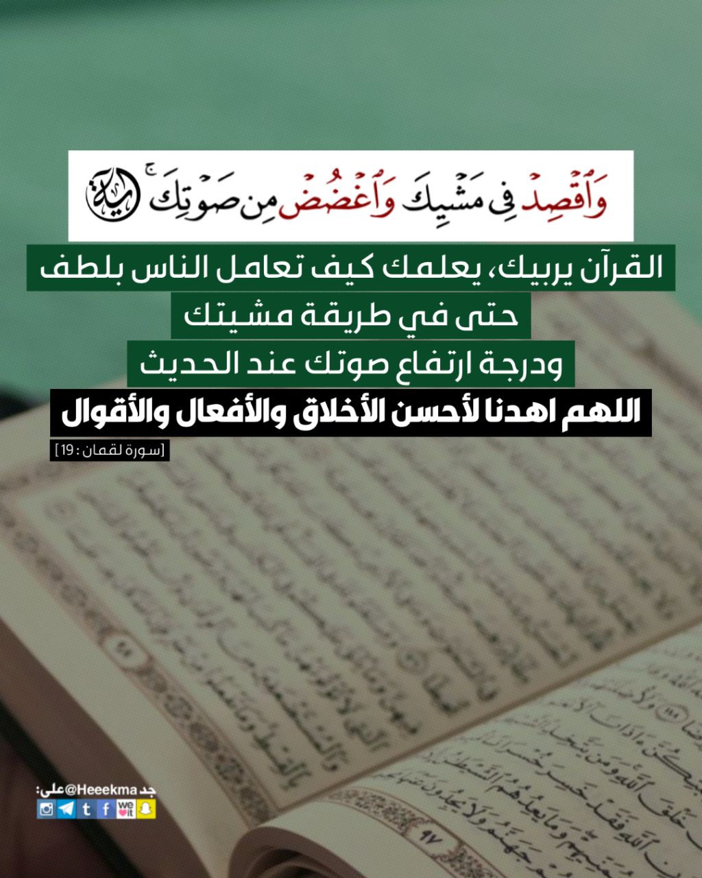 القرآن يربيك، يعلمك كيف تعامل الناس بلطف، حتى في طريقة مشيتك ودرجة ارتفاع صوتك عند الحديث! اللهم اهدنا لأحسن الأخلاق والأفعال والأقوال.