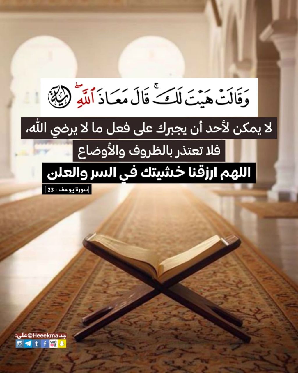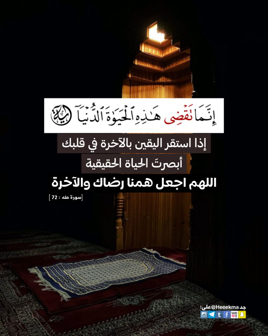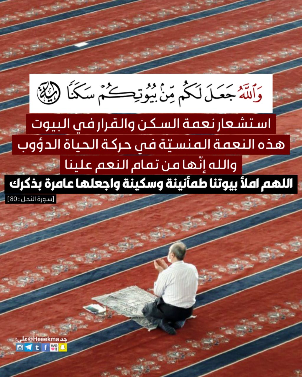 استشعار نعمة السكن والقرار في البيوت، هذه النعمة المنسيّة في حركة الحياة الدؤوب، والله إنّها من تمام النعم علينا، اللهم املأ بيوتنا طمأنينة وسكينة واجعلها عامرة بذكرك.