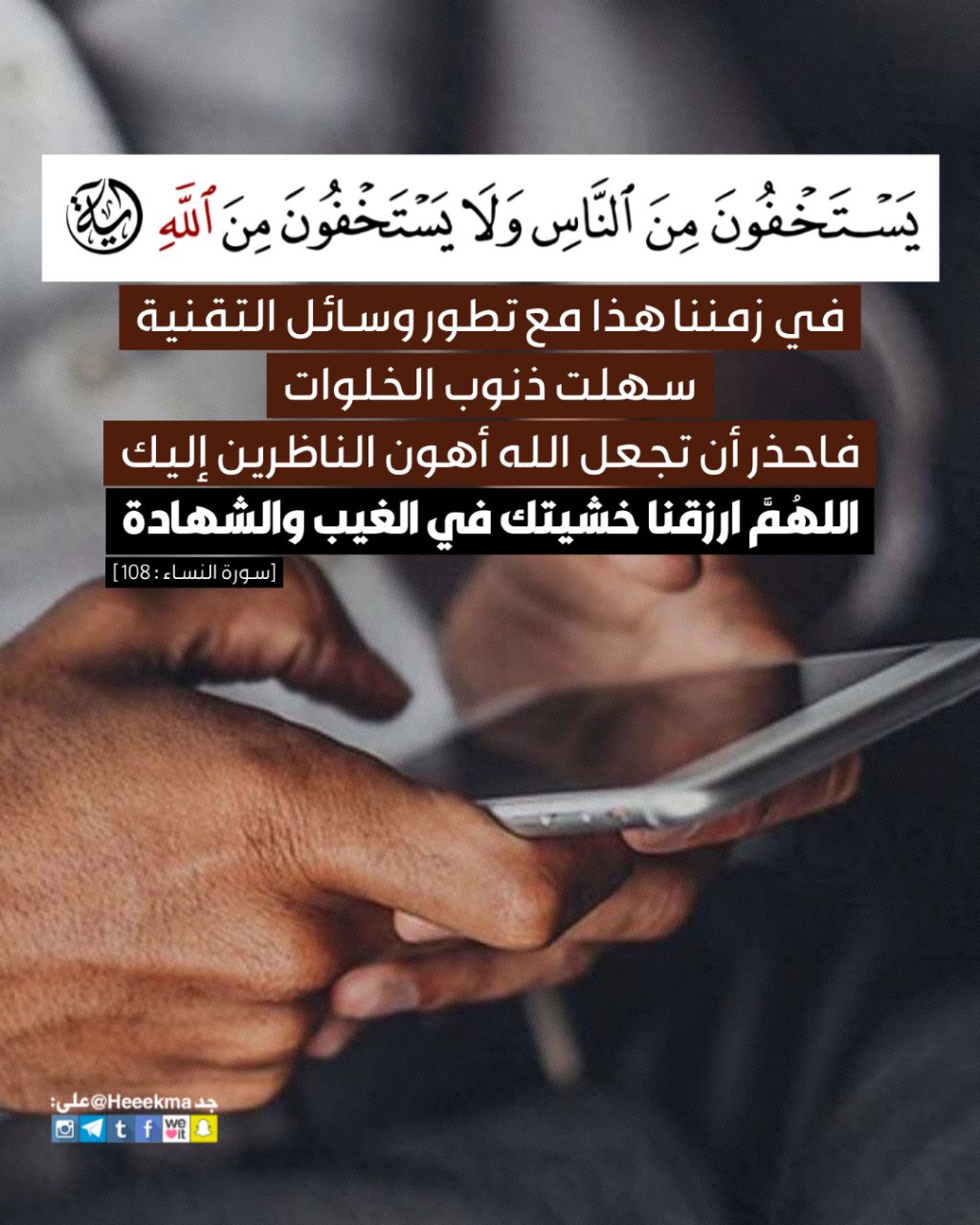 في زمننا هذا مع تطور وسائل التقنية سهلت ذنوب الخلوات فاحذر أن تجعل الله أهون الناظرين إليك، اللهُمَّ ارزقنا خشيتك في الغيب والشهادة.