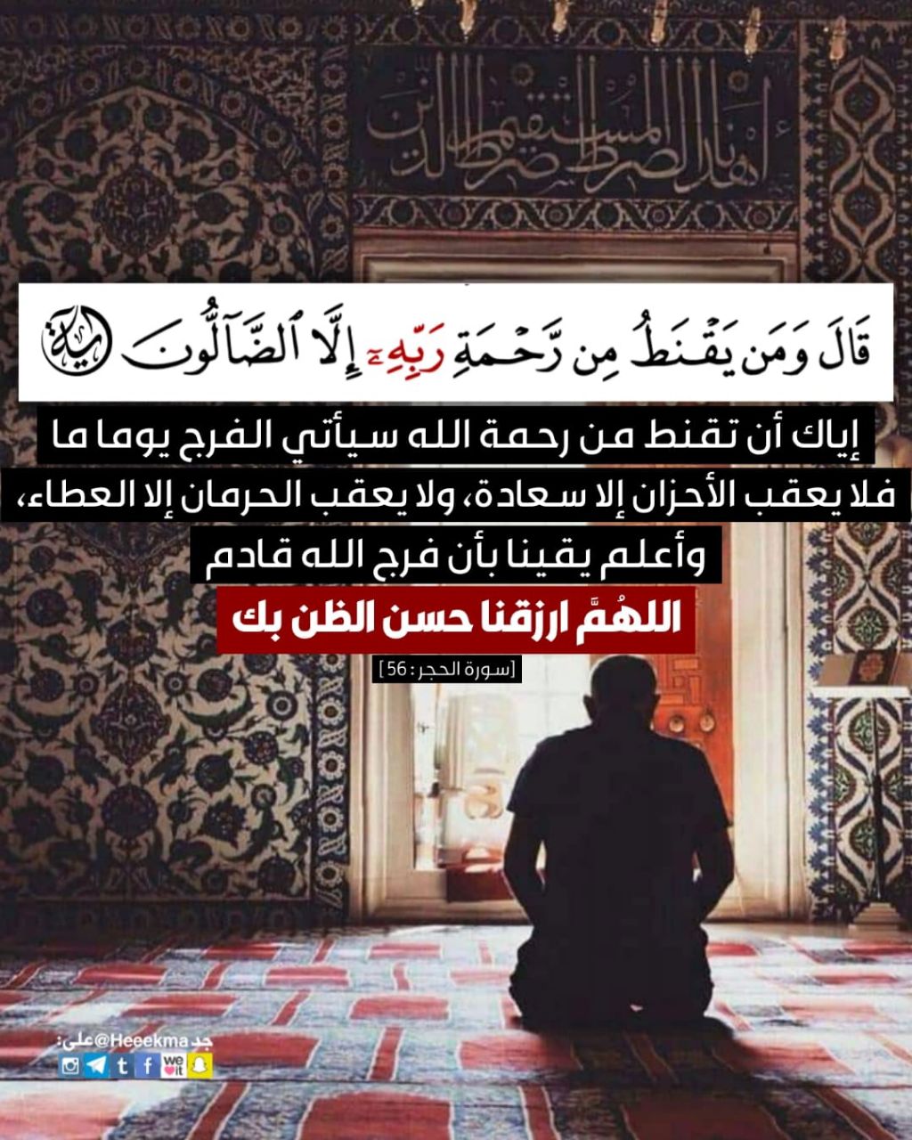 إياك أن تقنط من رحمة الله سيأتي الفرج يوماً ما، فلا يعقب الأحزان إلا سعادة، ولا يعقب الحرمان إلا العطاء، وأعلم يقيناً بأن فرج الله قادم، اللهُمَّ ارزقنا حسن الظنّ بك.