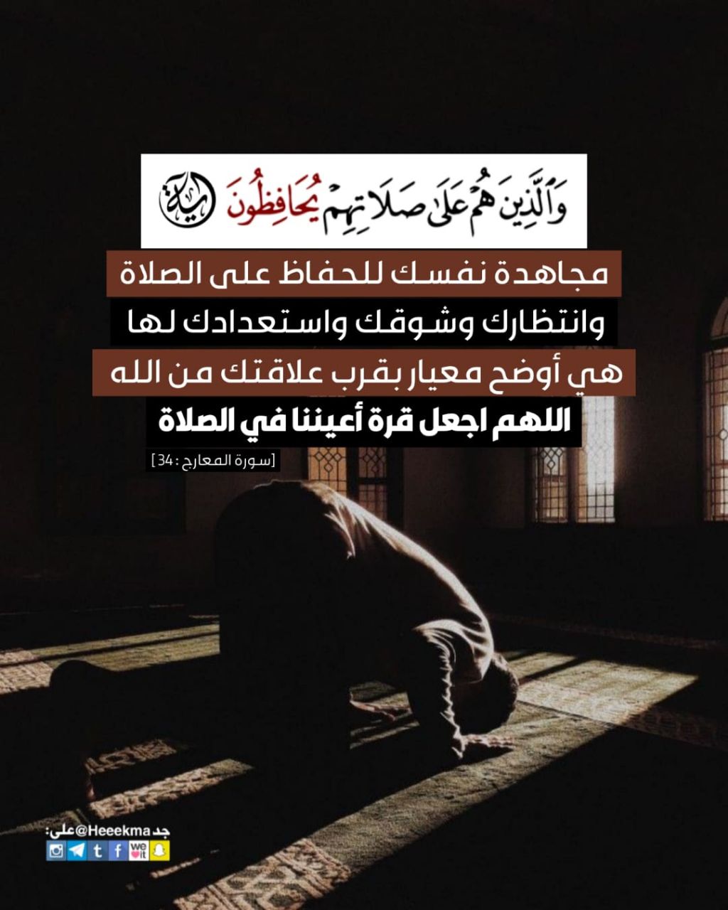 مجاهدة نفسك للحفاظ على الصلاة وانتظارك وشوقك واستعدادك لها هي أوضح معيار بقرب علاقتك من الله، اللهم اجعل قرة أعيننا في الصلاة.