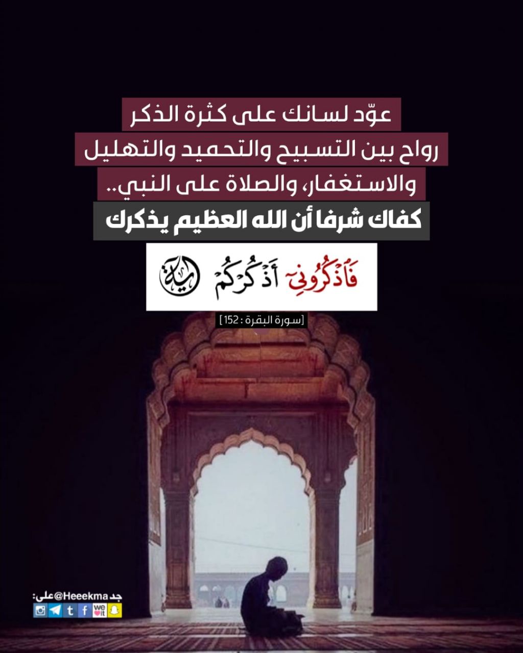 عوّد لسانك على كثرة الذكر، رواح بين التسبيح والتحميد والتهليل والاستغفار، والصلاة على النبي، كفاك شرفًا أن الله العظيم يذكرك .. (فَاذْكُرُونِي أَذْكُرْكُمْ).