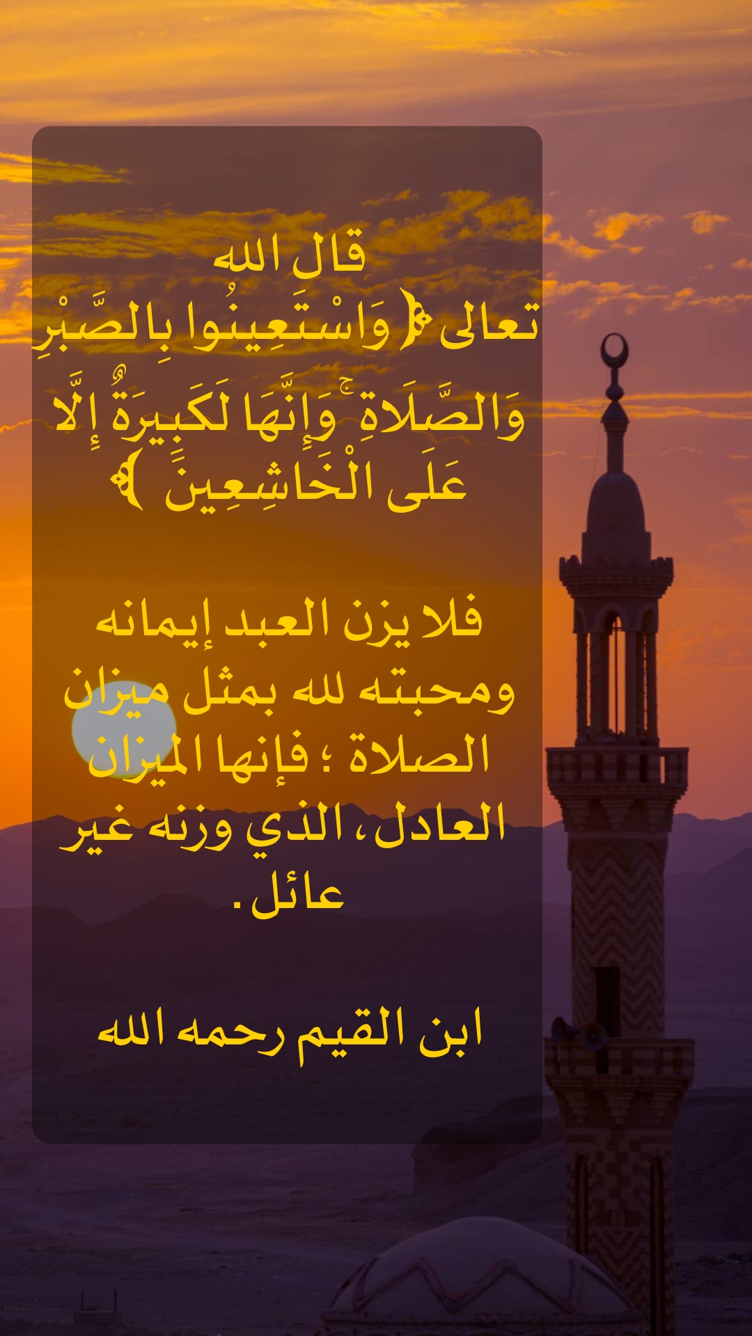 فلا يزن العبد إيمانه ومحبته لله بمثل ميزان الصلاة ؛ فإنها الميزان العادل، الذي وزنه غير عائل .