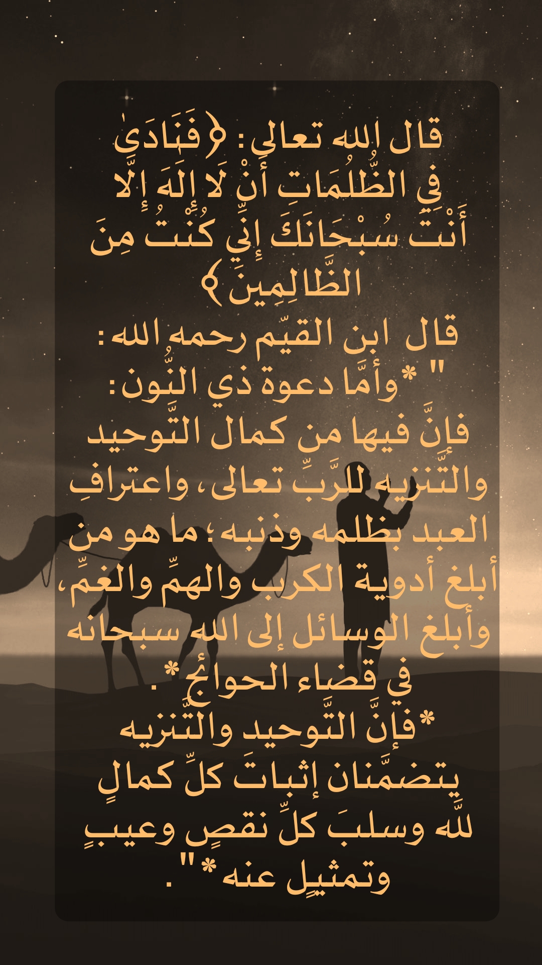 قال الله تعالى : (فَنَادَى فِي الظُّلُمَاتِ أَنْ لَا إِلَهَ إِلَّا أنْتَ سُبْحَانَكَ إِنِّي كُنْتُ مِنَ الظَّالِمِينَ )
