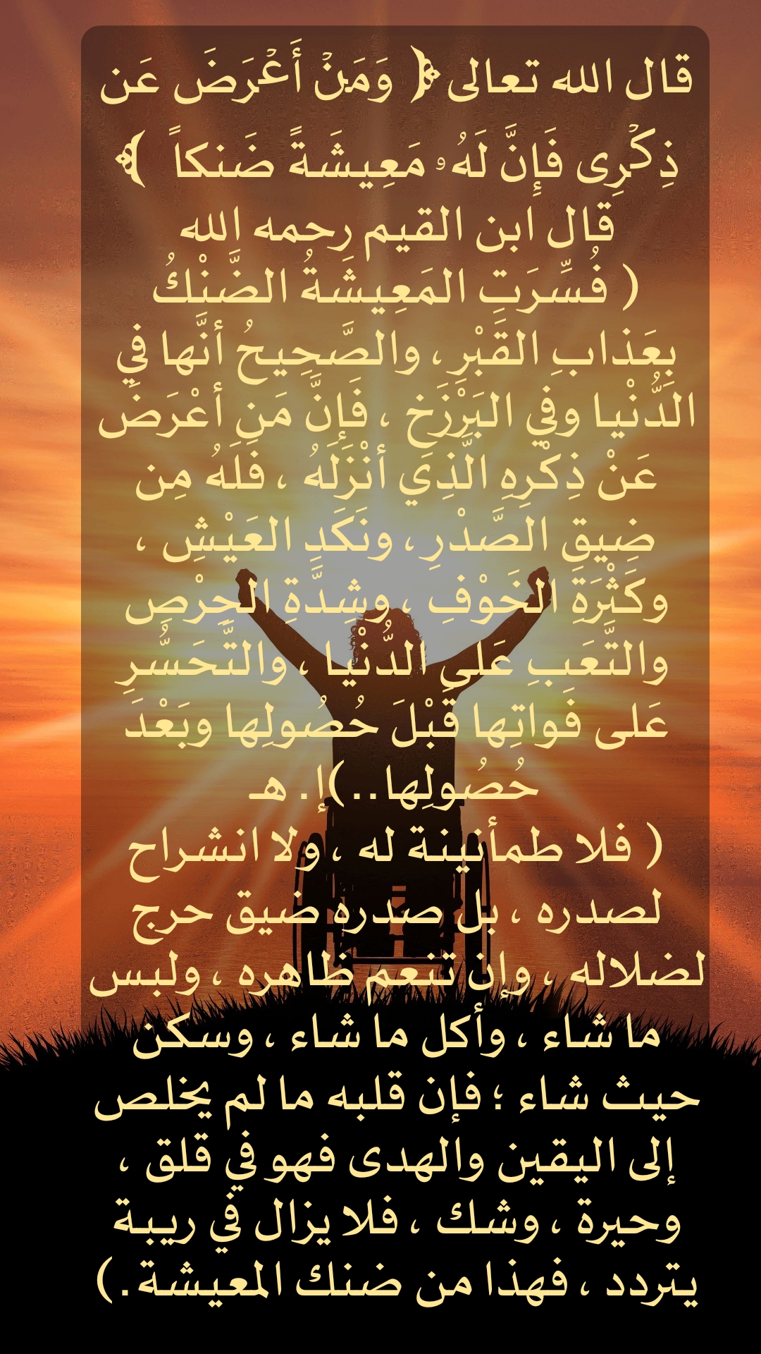 قال الله تعالى ( وَمَنْ أَعْرَضَ عَن ذِكْرِي فَإِنَّ لَهُ مَعِيشَةً ضَنكاً ) قال ابن القيم رحمه الله .