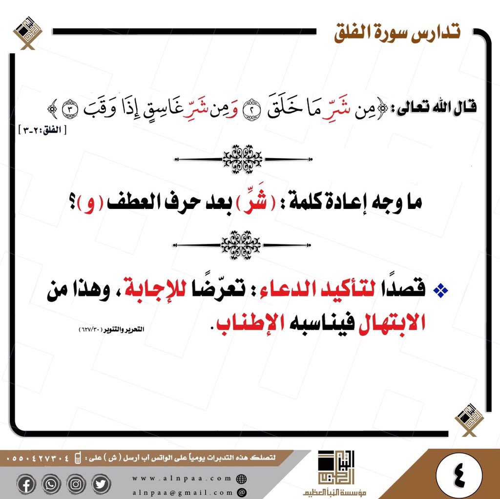 • التساؤل: قال تعالى: ﴿مِن شَرِّ مَا خَلَقَ • وَمِن شَرِّ غَاسِقٍ إِذَا وَقَبَ﴾ ما وجه إعادة كلمة: (شَرَّ) بعد حرف العطف (و)؟