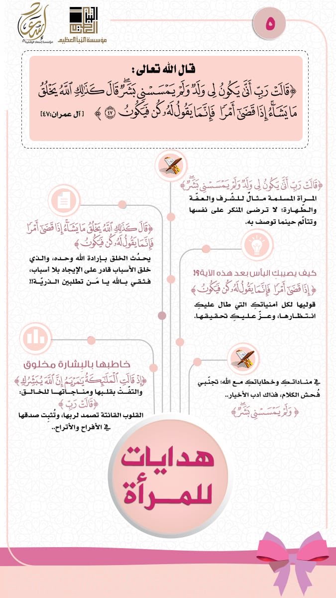 • ﴿قَالَتْ رَبِّ أَنَّى يَكُونُ لِي وَلَدٌ وَلَمْ يَمْسَسْنِي بَشَرٌ﴾ المرأة المسلمة مثال للشرف والعفة والطهارة؛ لا ترضى المنكر على نفسها وتتألم حينما توصف به.