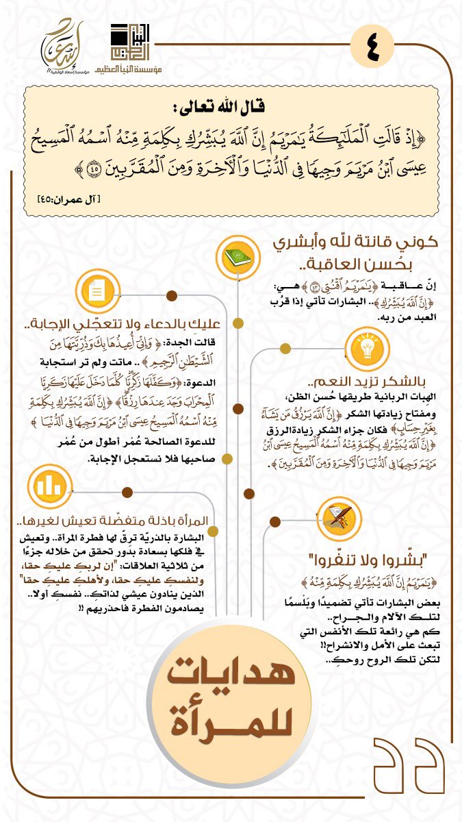 • كوني قانتة لله وأبشري بحُسن العاقبة .. ﴿يَا مَرْيَمُ اقْنُتِي﴾ هـى: ( إِنَّ اللَّهَ يُبَشِّرُكِ) .. البشارات تأتي إذا قرُب العبد من ربه.