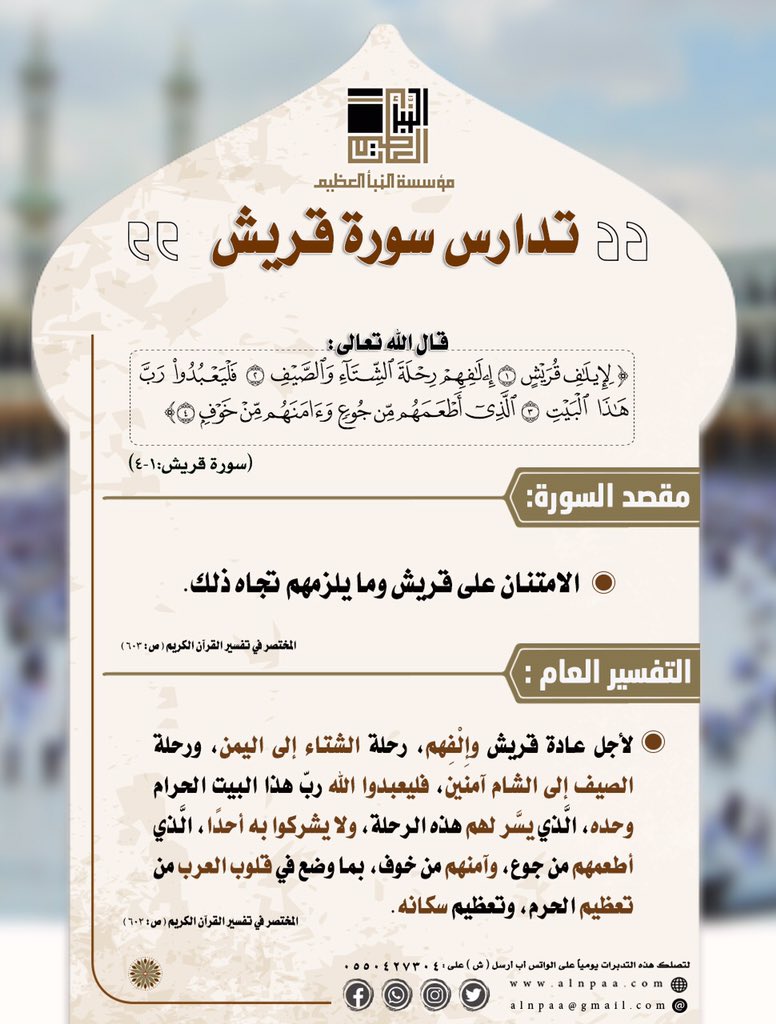 قال الله تعالى: ﴿لِإِيلَافِ قُرَيْشٍ • إِيلَافِهِمْ رِحْلَةَ الشِّتَاءِ وَالصَّيْفِ • فَلْيَعْبُدُوا رَبَّ هَذَا الْبَيْتِ • الَّذِي أَطْعَمَهُم مِّن جُوعٍ وَآمَنَهُم مِّنْ خَوْفٍ﴾: