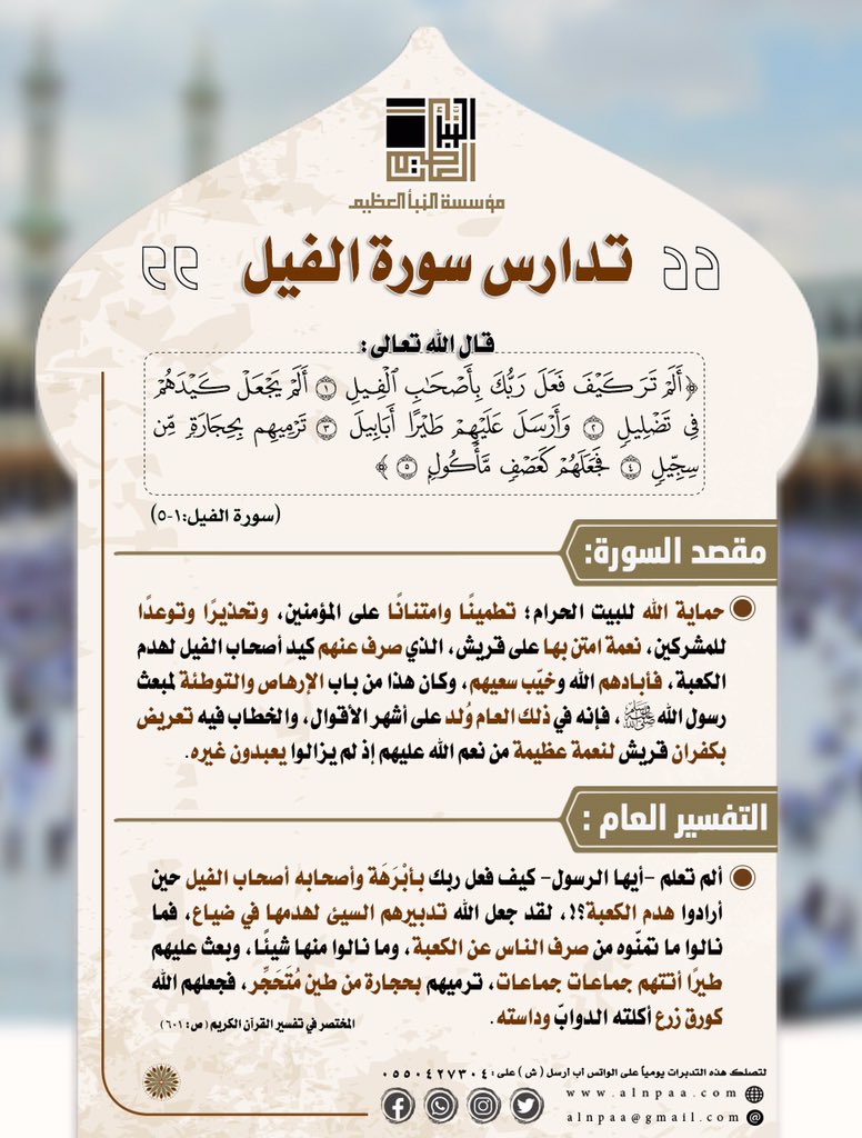 تدارس سورة الفيل: قال الله تعالى: ﴿أَلَمْ تَرَ كَيْفَ فَعَلَ رَبُّكَ بِأَصْحَابِ الْفِيلِ • أَلَمْ يَجْعَلْ كَيْدَهُمْ فِي تَضْلِيلٍ • وَأَرْسَلَ عَلَيْهِمْ طَيْرًا أَبَابِيلَ • تَرْمِيهِم بِحِجَارَةٍ... المزيد