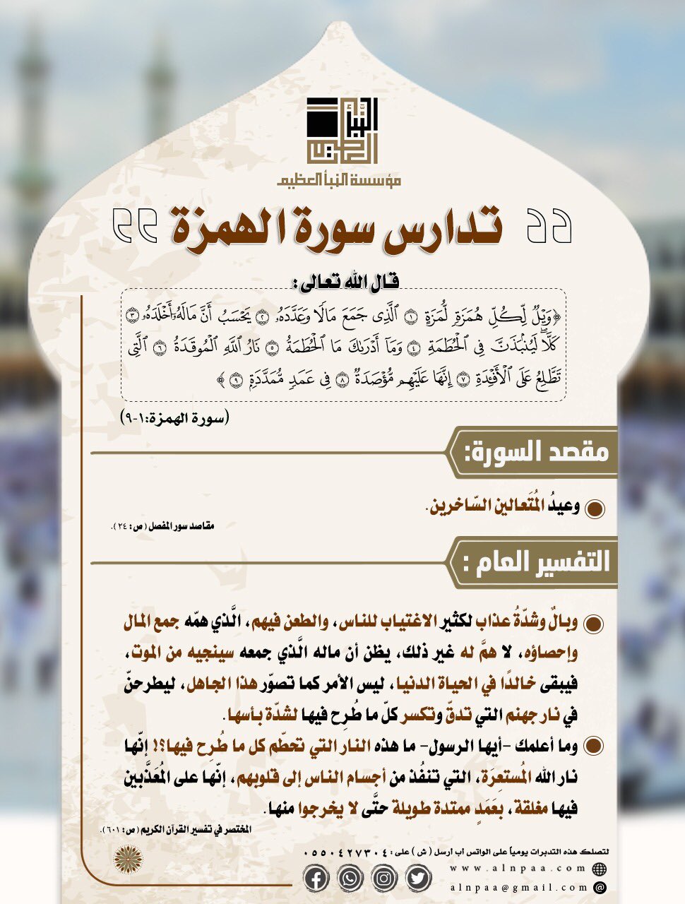 قال الله تعالى: ﴿وَيْلٌ لِّكُلِّ هُمَزَةٍ لُّمَزَةٍ • الَّذِي جَمَعَ مَالًا وَعَدَّدَهُ • يَحْسَبُ أَنَّ مَالَهُ أَخْلَدَهُ • كَلَّا لَيُنبَذَنَّ فِي الْحُطَمَةِ • وَمَا أَدْرَاك... المزيد