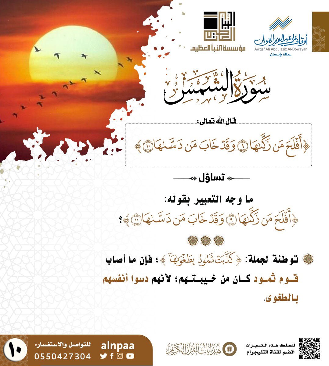 • إجابة التساؤل: توطئة لجملة: (كَذَّبَتْ ثَمُودُ بِطَغْوَاهَا)؛ فإن ما أصاب قوم ثمود كان من خيبـتـهم؛ لأنهم دسوا أنفسهم بالطغوى.