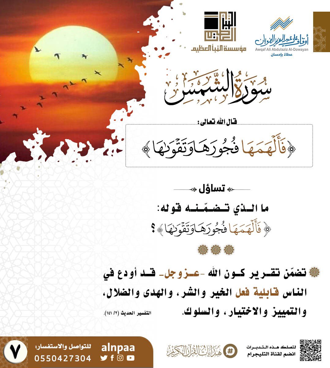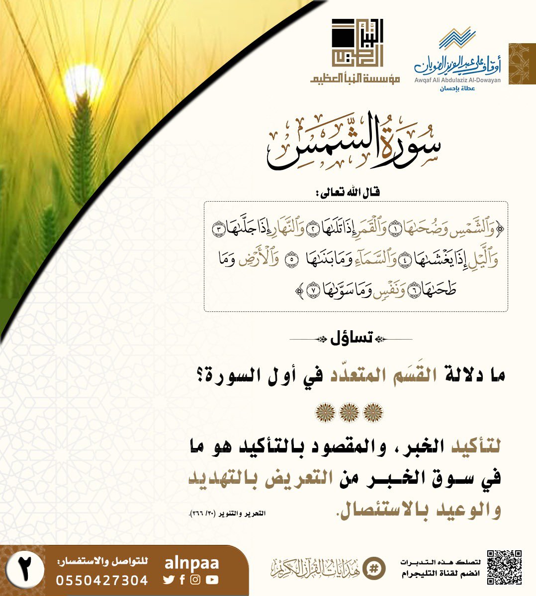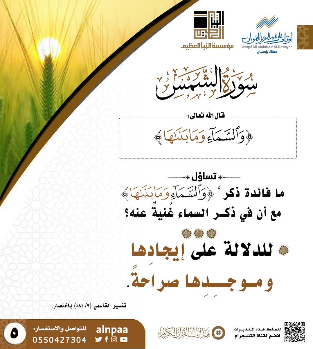 ▪️ التساؤل: قال الله تعالى: ﴿وَالشَّمْسِ وَضُحَاهَا • وَالْقَمَرِ إِذَا تَلَاهَا • وَالنَّهَارِ إِذَا جَلَّاهَا • وَاللَّيْلِ إِذَا يَغْشَاهَا • وَالسَّمَاءِ وَمَا بَنَاهَا • وَالْأَرْضِ وَمَا طَحَاهَ... المزيد