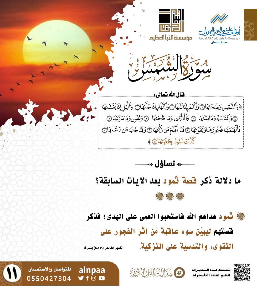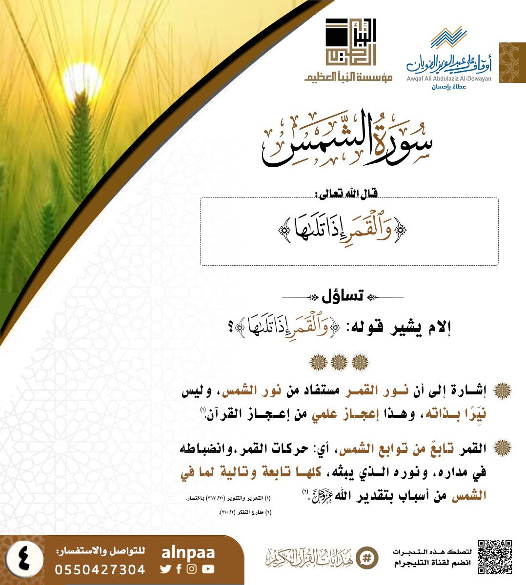 ▪️ التساؤل: قال الله تعالى: ﴿وَالشَّمْسِ وَضُحَاهَا • وَالْقَمَرِ إِذَا تَلَاهَا﴾ ما دلالة الابتداء بـ الشمس ثم القمـر؟