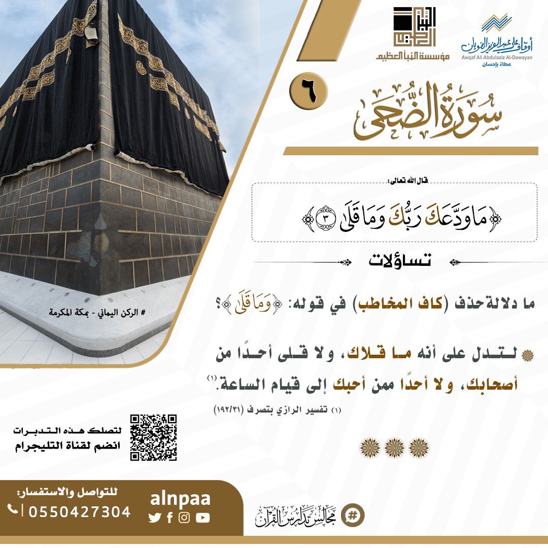 • التساؤل: ﴿مَا وَدَّعَكَ رَبُّكَ وَمَا قَلَى﴾ ما دلالة حذف (كاف المخاطب) في قوله: (وَمَا قَلَى)؟