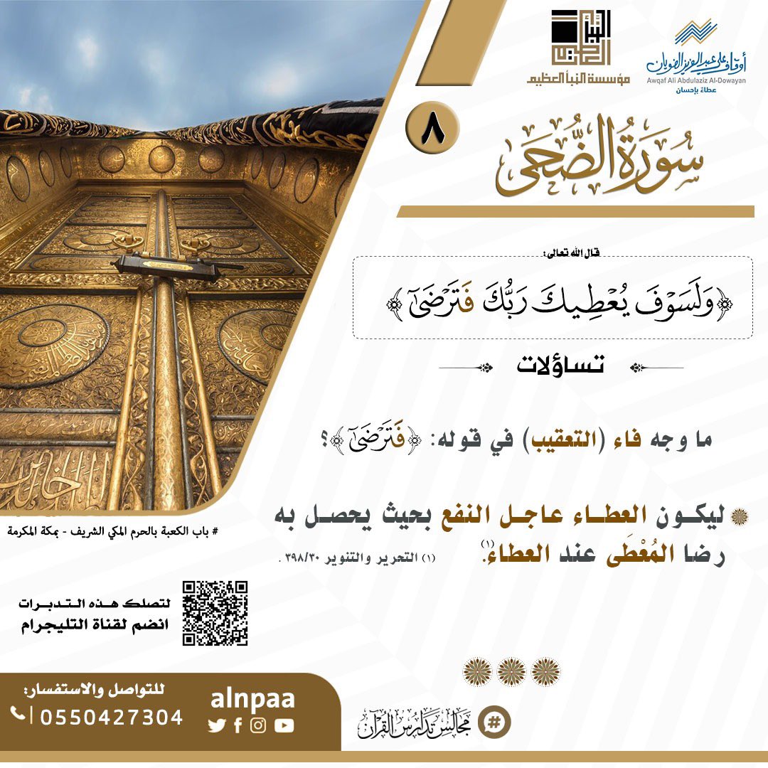 • التساؤل: ﴿وَلَسَوْفَ يُعْطِيكَ رَبُّكَ فَتَرْضَى﴾ ما وجه فاء (التعقيب) في قوله: (فَتَرْضَى)؟