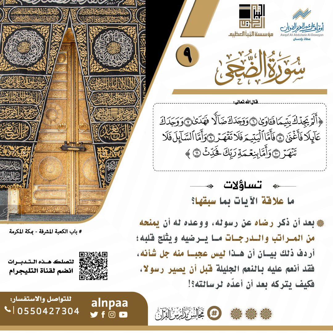 • التساؤل: ﴿أَلَمْ يَجِدْكَ يَتِيمًا فَآوَى • وَوَجَدَكَ ضَالًّا فَهَدَى • وَوَجَدَكَ عَائِلًا فَأَغْنَى • فَأَمَّا الْيَتِيمَ فَلَا تَقْهَرْ • وَأَمَّا السَّائِلَ فَلَا تَنْهَرْ • وَأَمَّا بِنِعْمَةِ... المزيد