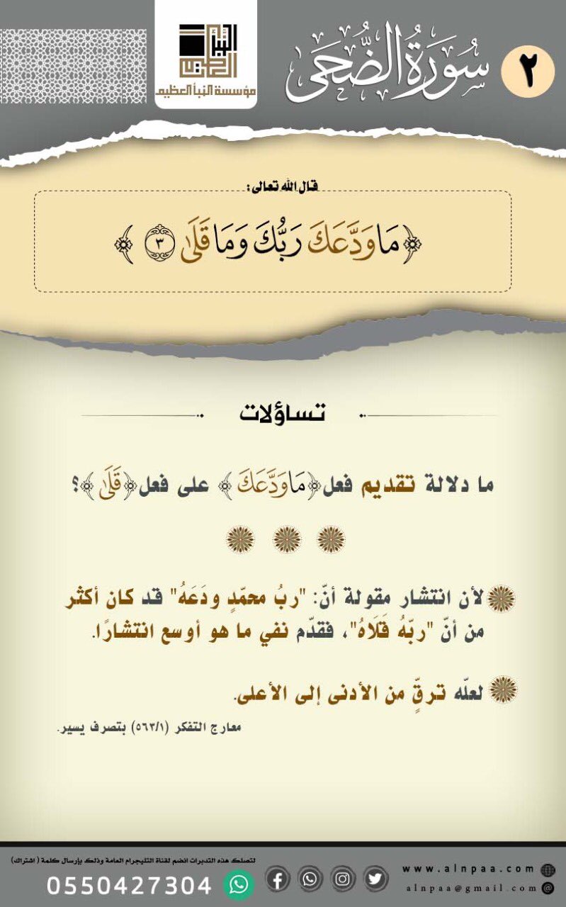 • التساؤل: ﴿مَا وَدَّعَكَ رَبُّكَ وَمَا قَلَى﴾ ما دلالة تقديم فعل (مَا وَدَّعَكَ) على فعل (قَلَى)؟