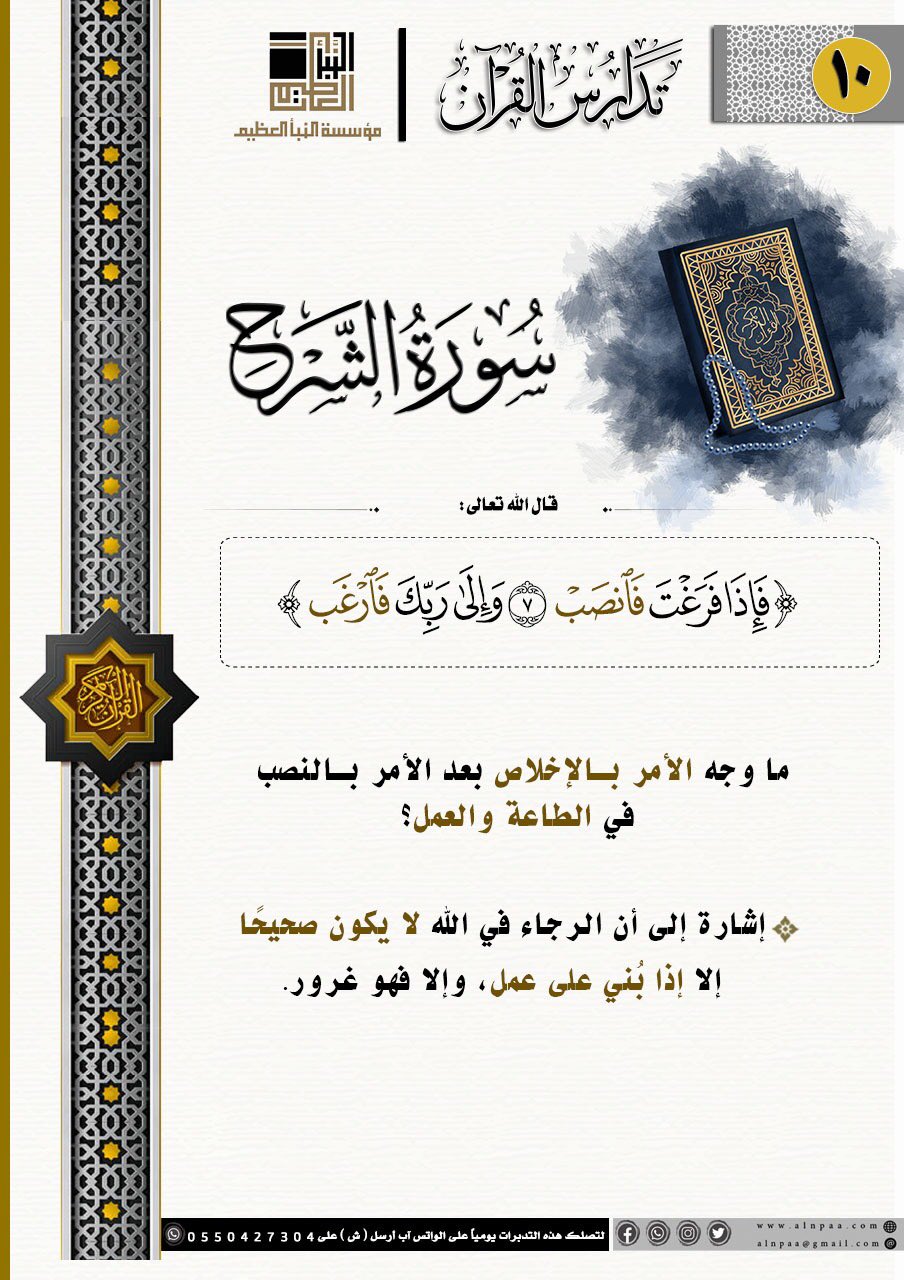 • التساؤل: ﴿فَإِذَا فَرَغْتَ فَانصَبْ • وَإِلَى رَبِّكَ فَارْغَبْ﴾ ما وجه الأمر بالإخلاص بعد الأمر بالنصب في الطاعة والعمل؟