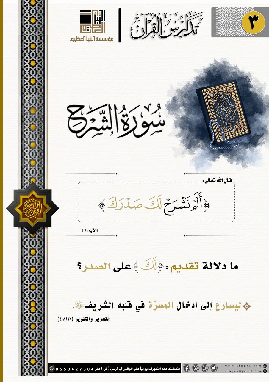 • التساؤل: ﴿أَلَمْ نَشْرَحْ لَكَ صَدْرَكَ﴾ ما دلالة تقديم: (لَكَ) على الصدر؟
